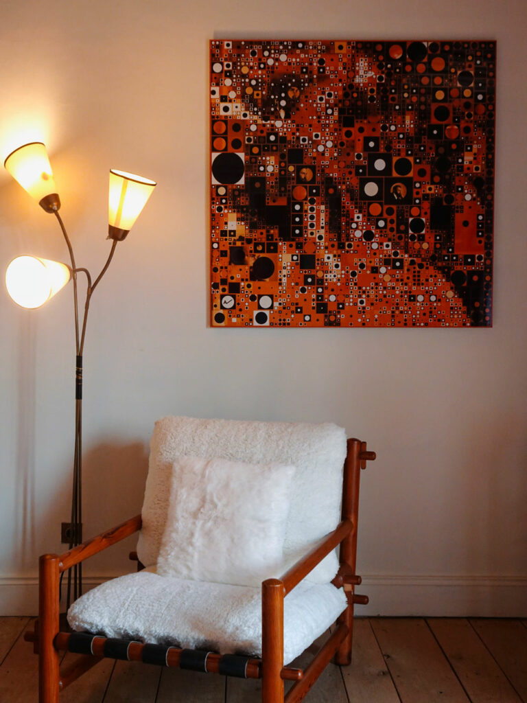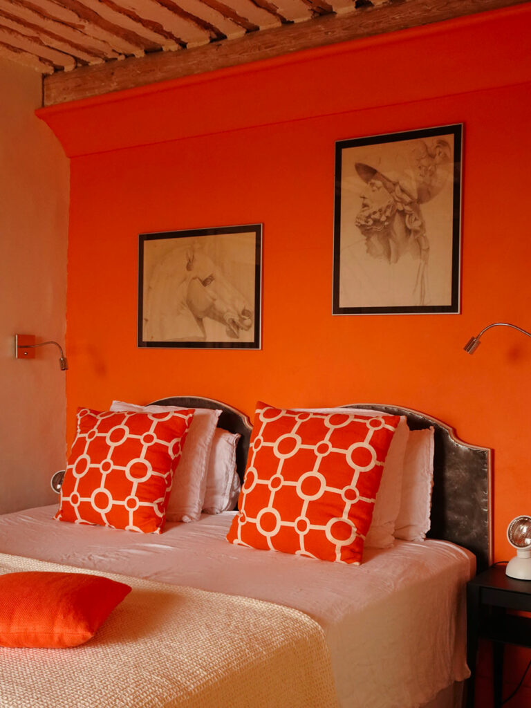 Spacieuse et baignée de tonalités d’orange, cette chambre conjugue énergie et douceur. Depuis le lit, le regard s’évade vers le jardin, la piscine et la plaine de la Crau qui s’étend à l’infini. La grande porte-fenêtre plein sud inonde la pièce de lumière. Bureau et table basse en cannage, fauteuils réconfortants, luminaires raffinés… Le mobilier des années 50 chiné avec soin et les œuvres de famille sur les murs composent un décor où authenticité et élégance se rencontrent.